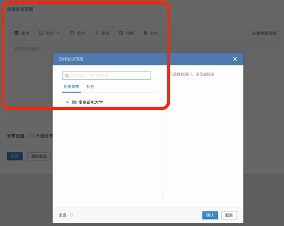 4 点击选择发送范围,在搜索框搜索工号、姓名或在组织架构/标签中选择适当选项(行政、教师、本科、硕士、博士)发送。选择南京邮电大学为全部企业微信用户(教职工、学生、外聘外来、家属等)。