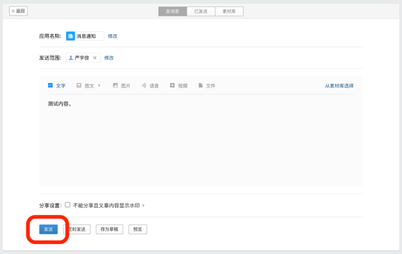 5 编写文字内容或类似微信公众号的图文信息后,即可发送。