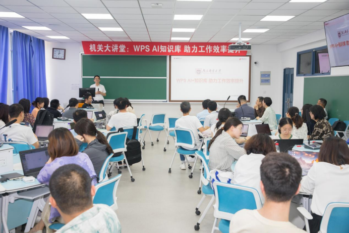 2026年5月14日下午,南京邮电大学信息化建设与管理办公室配合机关党委在教4-208(2)教室举办机关大讲堂专题培训,特邀金山办公金牌培训师为机关部门工作人员开展“WPS AI知识库 助力工作效率提升”专题培训。校党委副书记蒋国平出席活动并致辞,金山办公全国教育事业部负责人张广磊及学校各职能部门代表参会,信息办王海勇主任主持会议。
